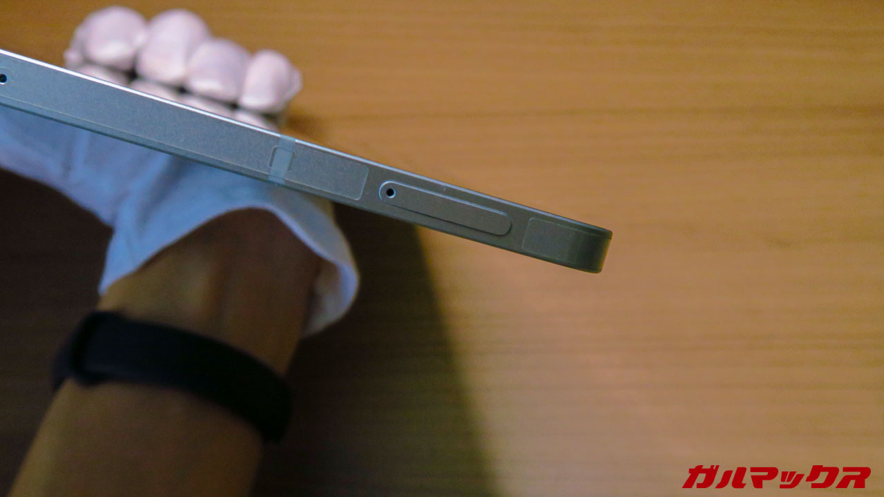 ▼インカメラのあるベゼルに面する上面は電源キー(指紋センサー)と音量キー。そっから右側面は充電端子。左側にはMicroSDスロットが配置されています。↓
