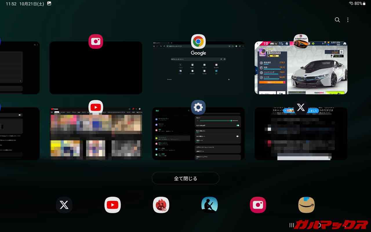 ▼アプリ履歴画面も最適化されており、一覧に表示される数が多く全て閉じるボタンが常時表示されてるってのがとても便利。↓