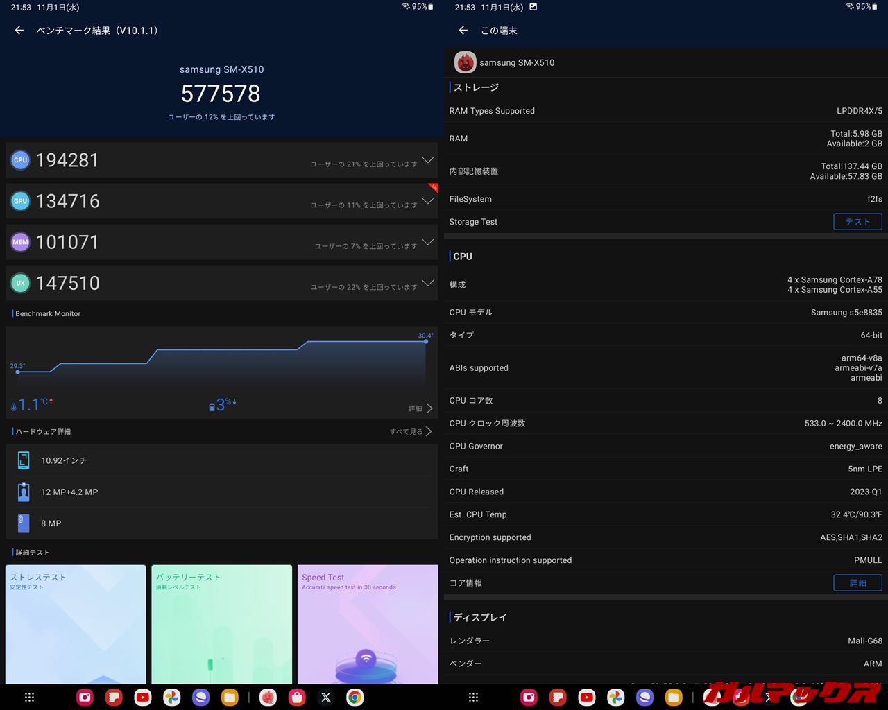 しかし、強力なライバルとしてはやはりXiaomi Pad 6が立ちはだかります。Snapdragon 870(AnTuTu80万点)を搭載し、発売当時の価格は5万円(海外だと4.2万円)。つまり性能でも安さでも負けているんですよね。
