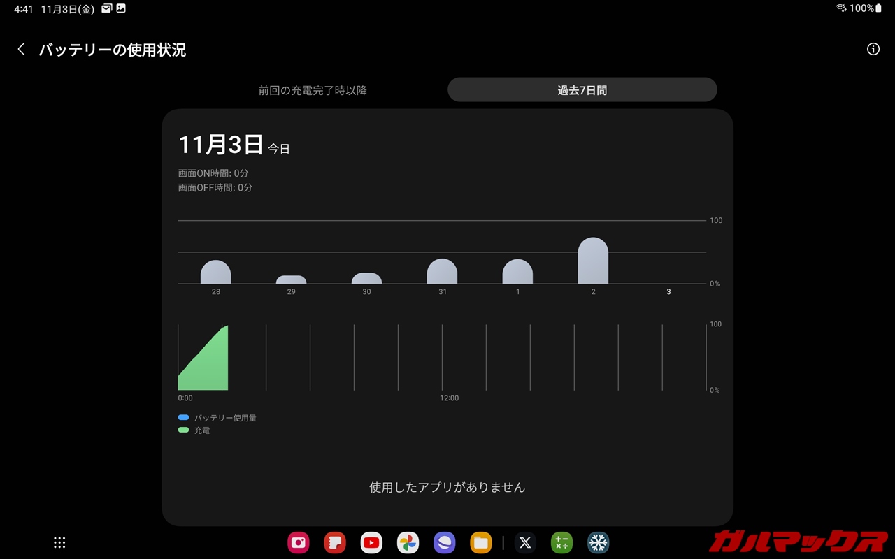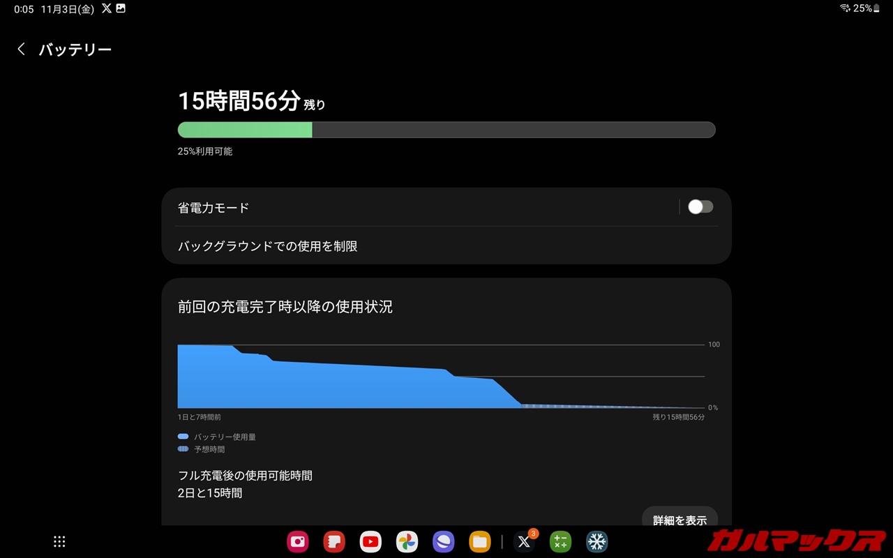 ▼バッテリー容量は8,000mAhとタブレットとしてはなかなかの大きさですが、電池持ちは特段良いわけではありません。普通に減っていくって感じ。極端な短さこそありませんが、YouTubeで動画を見まくれば2時間で35%消費とゴッソリ消えていきます。↓