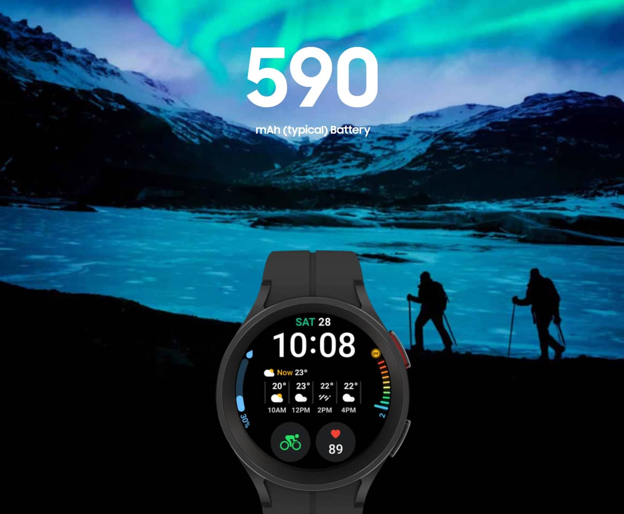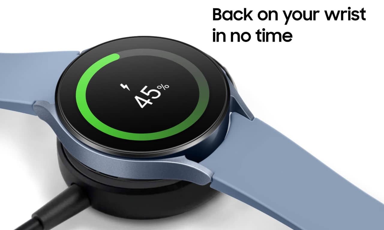 ▼バッテリー容量は590mAhでGalaxy Watch 5よりも大きいのですが、具体的にバッテリーが何時間持つかは不明。アウトドア向けモデルゆえ1~2日はもってほしいところですね。またこちらも急速充電に対応しています!↓