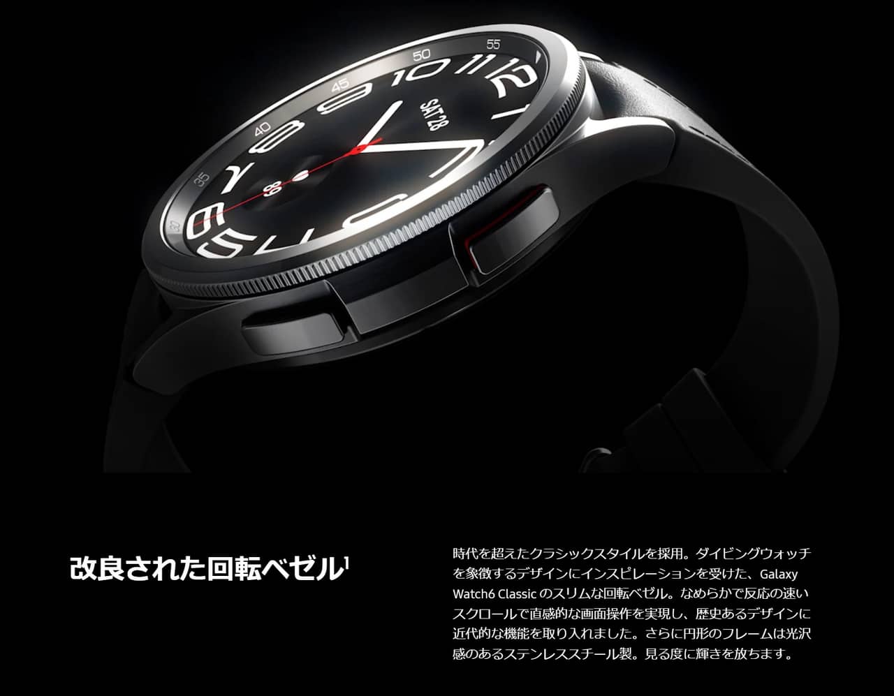 ▼また派生モデルとしてGalaxy Watch6 Classicも登場していますよ!こちらはご覧の通り本物の腕時計みたいな意匠になっておりまさにクラシカルな外観デザインです。↓