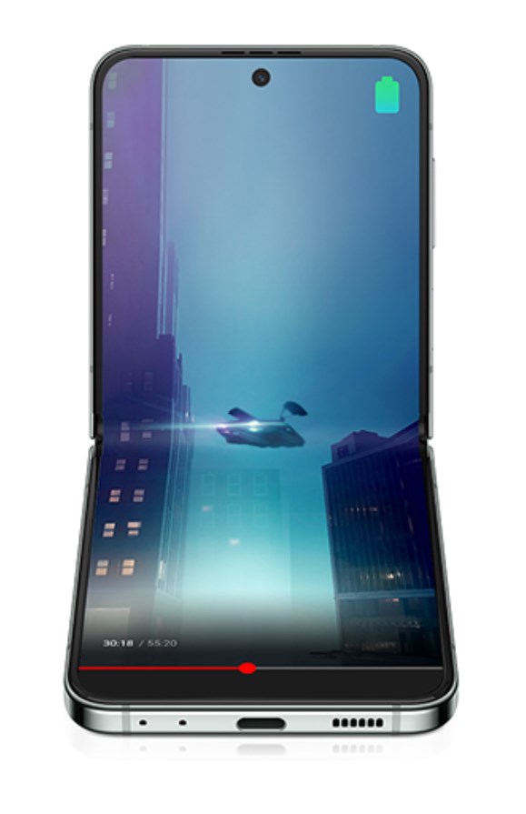 ▼Z Flipシリーズではおなじみとも言えるタテ折りタイプのスマホなので折りたためばかなりコンパクトになるのが特徴!たたんだ状態ではタテの高さが85.1mm、厚みは15.1mmになり、底の浅めなポケットにも入れやすくなる仕組み。↓