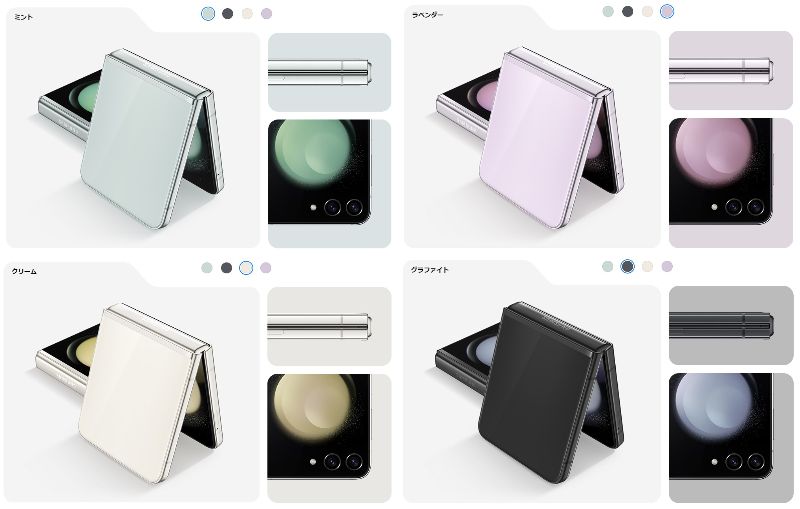 ▼Galaxy Z Flip5のカラーはミントとラベンダー、クリームとグラファイト(ブラック)の4色構成。実に可愛らしいラインナップっす。↓