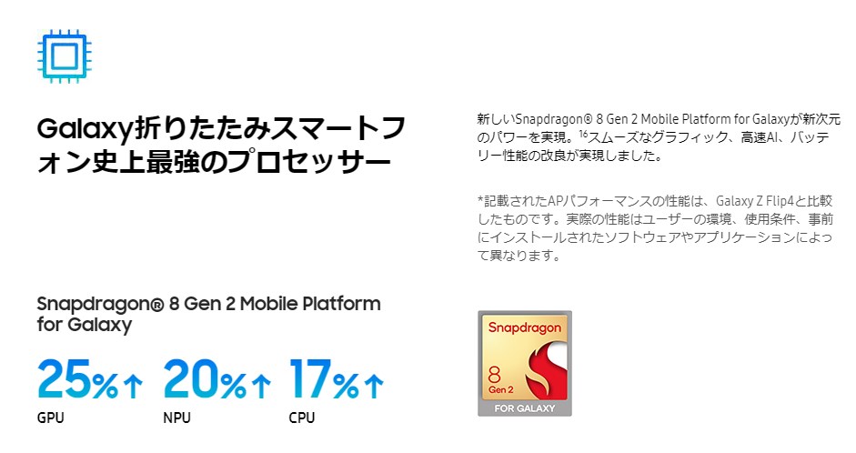 ▼SoCはSnapdragon 8 Gen 2のGalaxy向けカスタマイズチップを搭載!Galaxy S23シリーズにも搭載されているハイエンドな性能を持つSoCで性能、安定性、電池持ちいずれもバッチリなものとなっています。↓