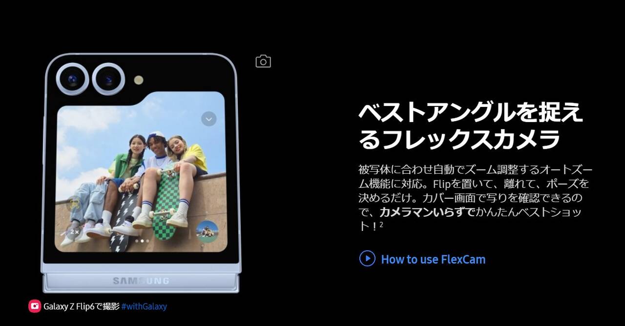 ▼折りたたみとカバー画面を活かして、こんな感じでスタンドがなくても凝った自撮りができるってのも折りたたみスマホならではな魅力でしょう。さらに被写体の配置でズームを自動調節する機能もあるとのこと!後からトリミングする手間を減らせそうですね。↓