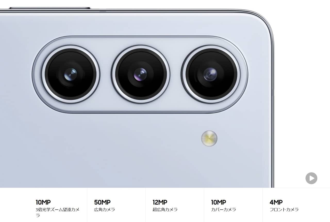 ▼カメラは5,000万画素のメインカメラ、1,200万画素の超広角カメラ、1,000万画素の3倍望遠カメラを搭載!カバー画面のインカメラは1,000万画素、メインカメラのインカメラは400万画素となっています。↓