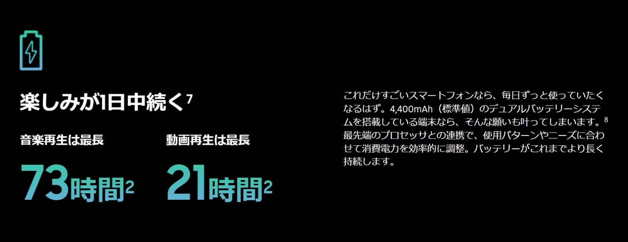 ▼バッテリー容量は4,400mAhと平均より若干下ですが、SoCの電力効率が良いためか動画再生時間は最長21時間とかなり電池持ちよさそうですね!大抵のモデルは5,000mAhで動画再生時間は16~17時間ほどなので個人的にかなり期待してる。↓