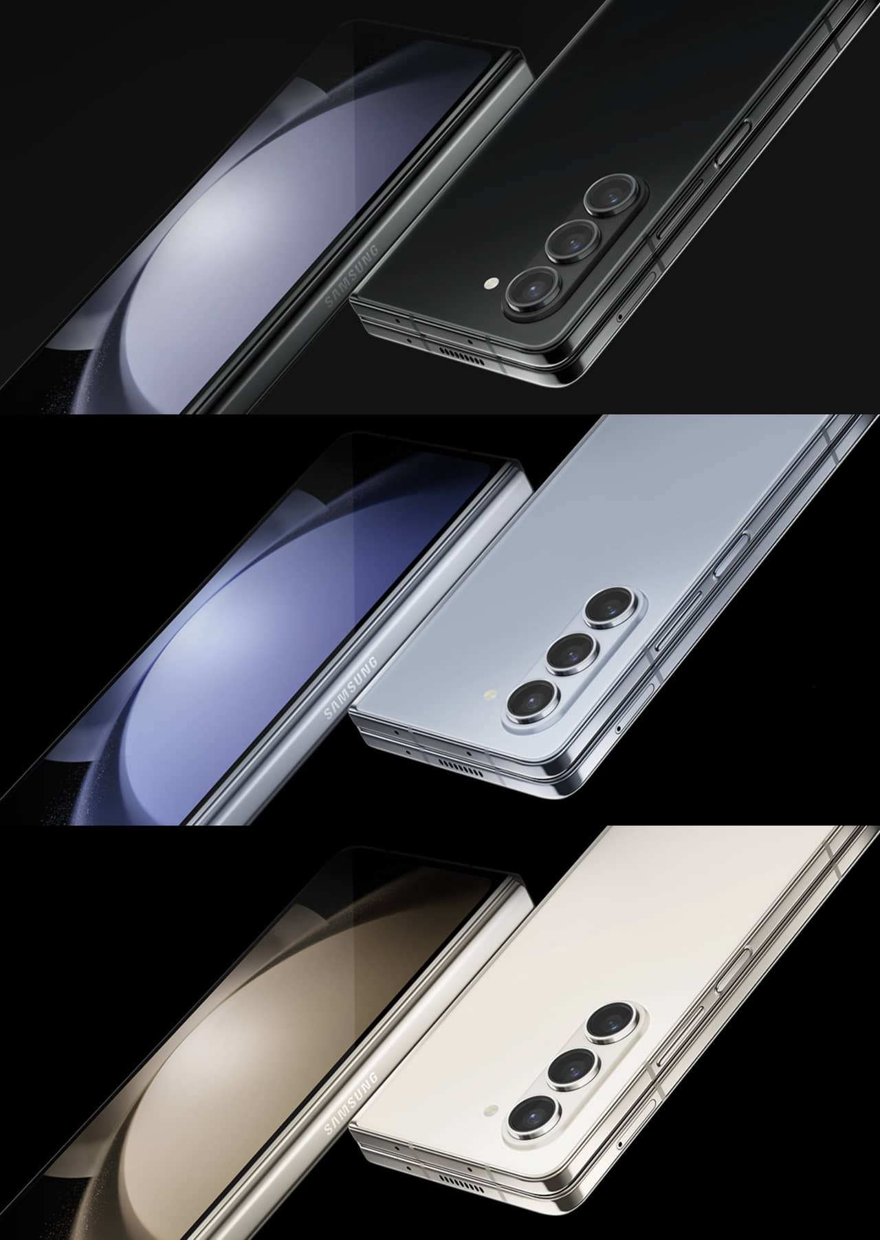 ▼Galaxy Z Fold5のカラーはブラック、ブルー、ゴールドの3つ!可愛らしさをウリにしているFlip5とは趣が異なりビジネスライクな印象を受けるカラバリっす。↓