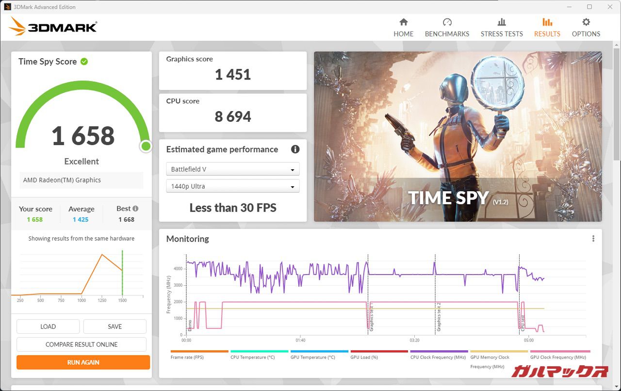 Ryzen 7 5800Hはゲーム性能の高いAMD Radeon Vega 8 Graphicsを搭載してます。最近の携帯ゲームPCに搭載されているRyzen 7 7840UのAMD Radeon 780Mには全く敵わないけど、それでも昔のオンボードGPUとは比べ物にならないゲーム性能です。