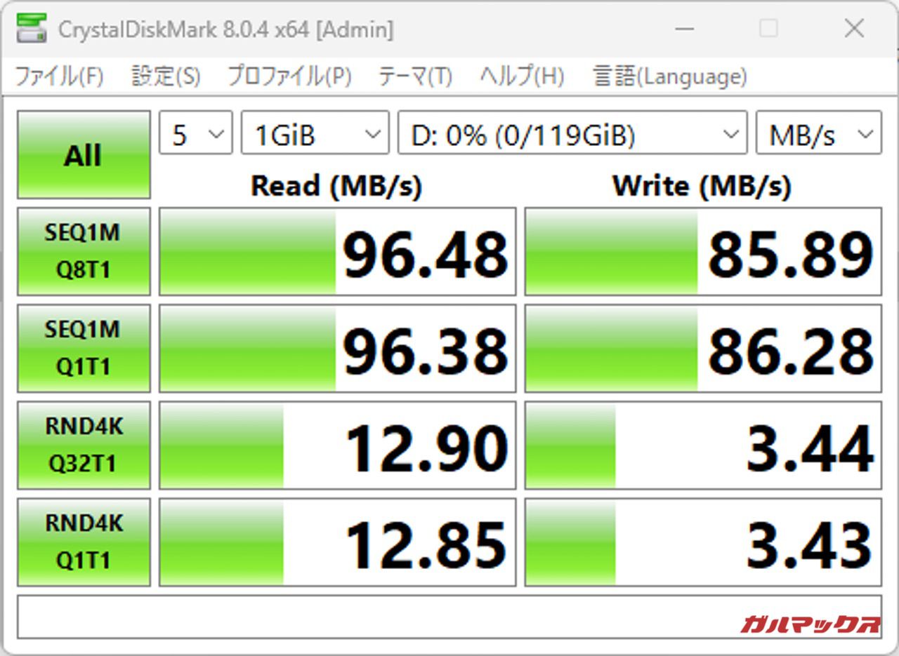 ▼速度はそんなに出ないみたいです。180MB/sのSDカードで速度を測定したところ、読み込みは96.48MB/sで頭打ちとなってました。僕みたいに基本FHDソースなら良いけど4Kソースならちょっとしんどいかも。まあ十分実用的ではありますが。↓