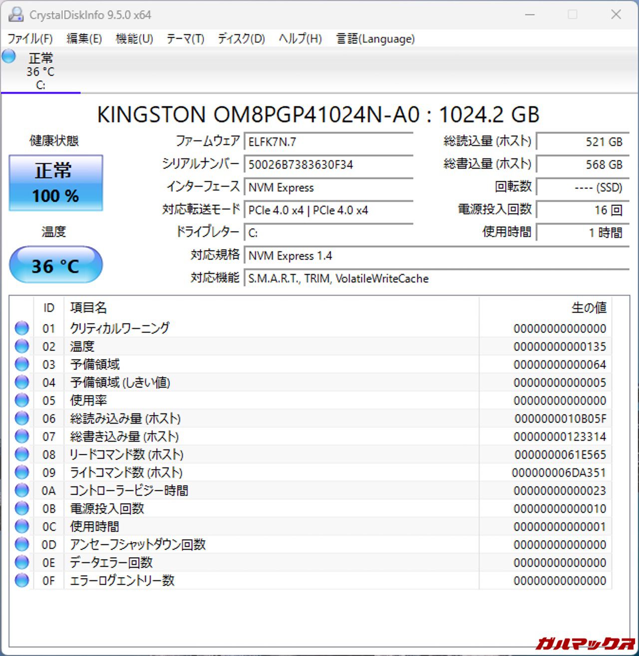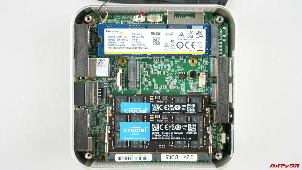 ▼メモリはCrucialのDDR5-5600/16GBが2枚刺さってました。メーカー資料ではDDR5-4800と記載されてたのでちょっと違いますね。ストレージはKingstonの1024GBが刺さってました。このあたりもメジャーなメーカー品が使われてて良いですね。↓