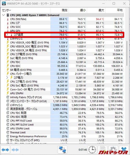 Ryzen 7 6800Hは6nmプロセスルールのCPUでH印付きのハイパフォーマンス版だから結構発熱しやすいのかも?