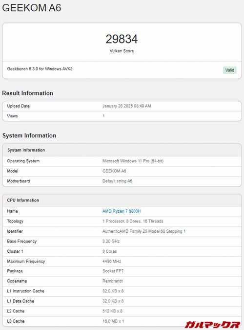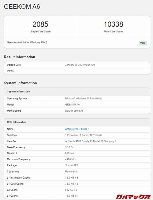 GEEKOM A6が搭載するCPUはRyzen 7 6800HでGPUはRadeon 680M。最新ってわけじゃないけれど、2025年2月時点でも相当パワフル。