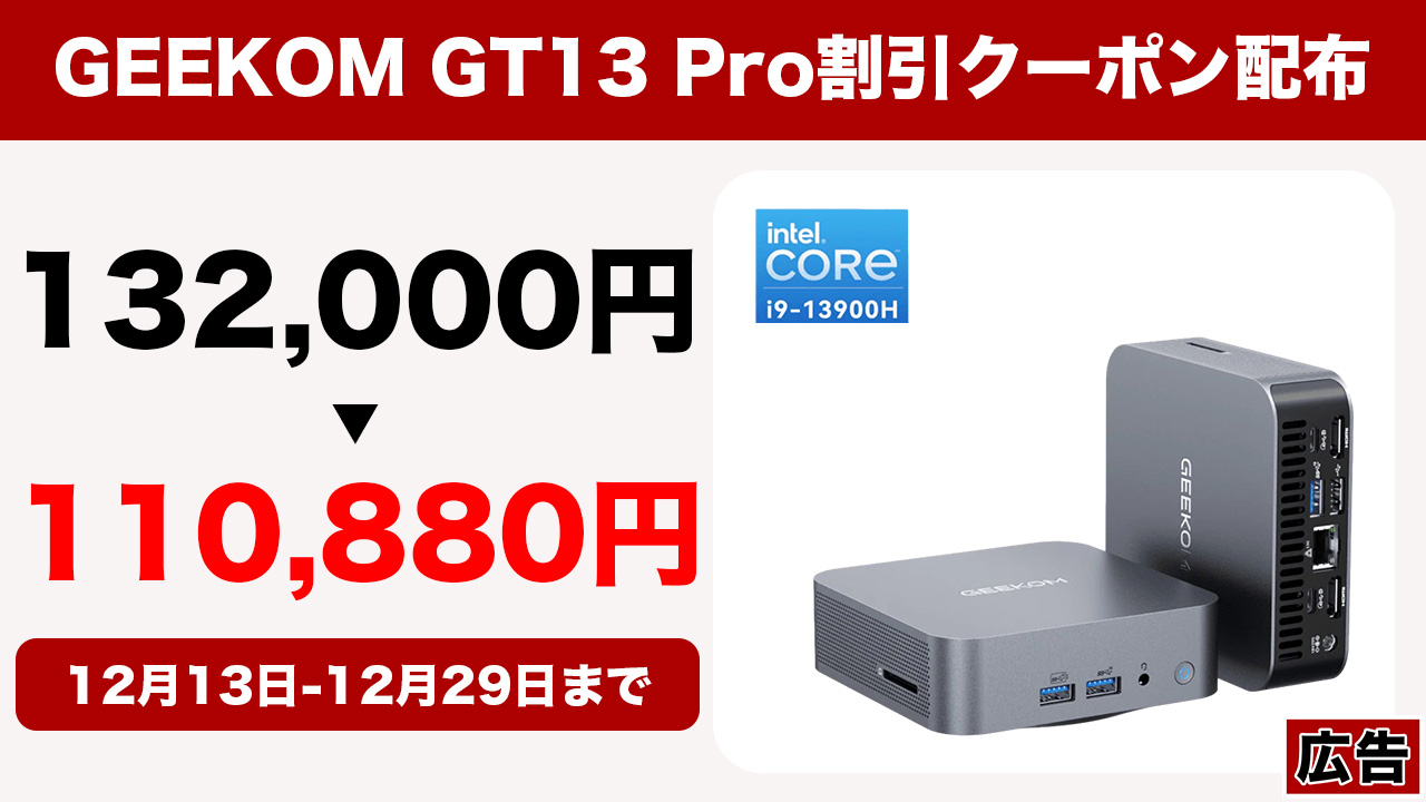 Core i9-13900H搭載ミニPC「GEEKOM GT13 Pro」が132,000円→110,880円クーポン配布