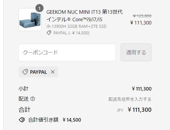 ▼1番目に試すPayPal割引は以下!レジ画面で以下のクーポンを適用してから支払いをPayPalに指定するとOK!適用で111,300円!先着80名!↓