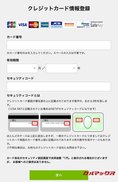▼クレジットカード情報を入力しよう。入力後は次へをクリック。↓