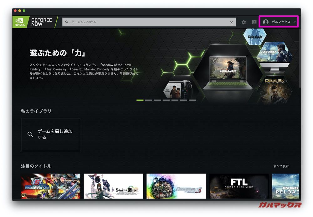 ▼GeForce NOWクライアントを確認すると画面右上にニックネームが表示されログイン状態に!お疲れさまでした!↓