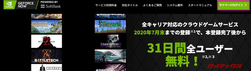 ▼GeForce NOWのWEBページにアクセス。右上に表示されている「マイページログイン」をクリック。↓