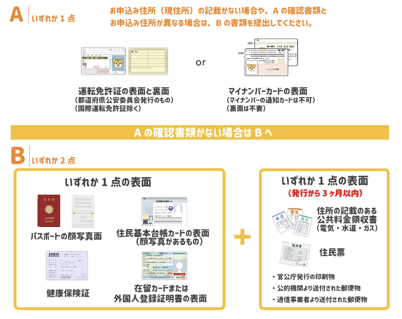 ▼本人確認書類で必要なものは以下の通り。Aなら1点、Bの場合は補助書類が必要となるんで申込み前に確認しましょう。↓