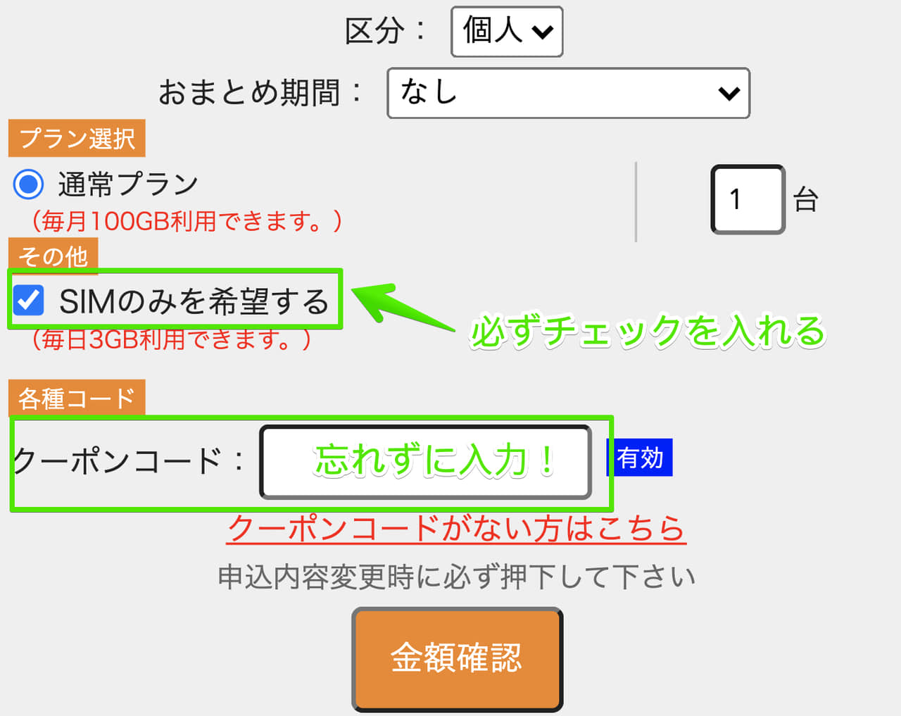 申込み時は必ず「SIMのみを希望する」にチェックを入れましょう。また、クーポンコードを持っていなくてもギガトラWiFiが発行するクーポンコードは誰でも使えるので、持っていない方は「クーポンコードがない方はこちら」から取得しましょう。