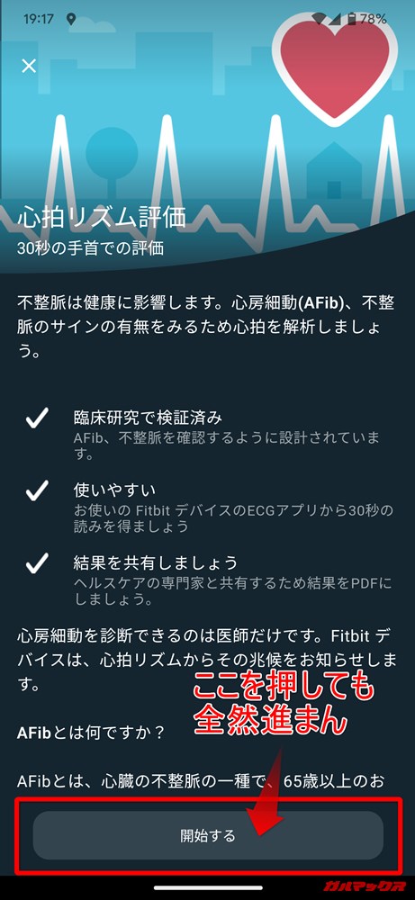 ▼Fitbit 心電図アプリは起動できるんですが、同意画面から全然先に進めません。↓