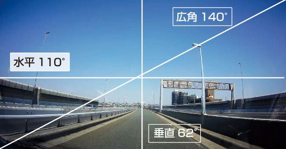 交通事故は正面から発生するとは限りません。斜め前や横など幅広い画角で撮影できたほうが安心感があると、体感的に理解できるかと思います。一般的にドライブレコーダーは「水平画角100度以上」「垂直画角55度以上」あると良いといわれています。