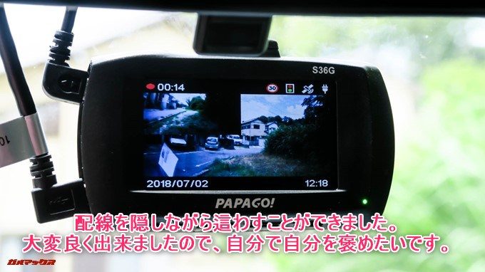 ▼端っこに付けちゃうと視野の広さが左右で変わってしまうのでGoSafe S36GS1の本体はできればフロントガラスの上部中央への設置が良いです。バックカメラも接続してカメラが正常に動くかチェックしましょう。↓