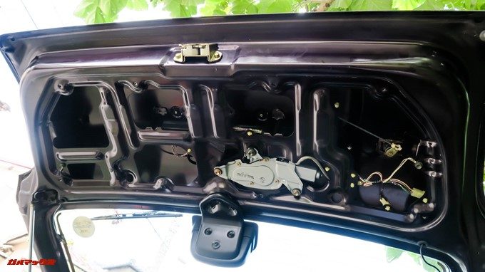 ▼僕の愛車はミラジーノ。バックドアの内側に+ネジがむき出しのイージーな奴です。速攻全部のネジを外しました。↓