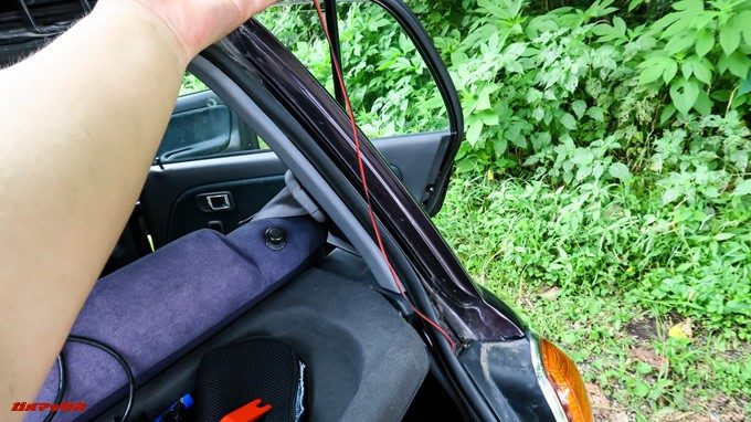 ▼まずはバックカメラのリバースケーブルを這わします。車のバックドア周囲についてるパッキンを引っ張って外して隠しましょう。↓