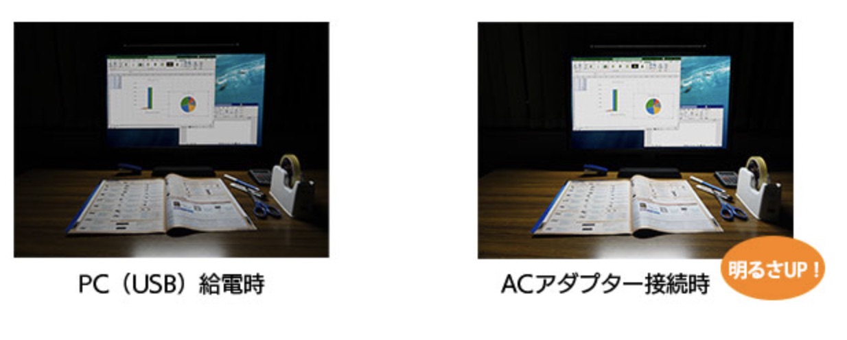 あと、この類の製品はUSB給電のみ対応するものが多いんですが、GP-ML40LDT/Bは付属のACアダプターを使えば明るさをアップすることが出来るんです!