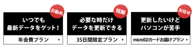 少々説明が必要なのですが、1と2はオービス&コンテンツデータの更新のみです。地図データは更新されません。一方、MicroSDカードお届けプランは最新の地図データ+申込時点の最新オービス&コンテンツデータが入ってます。