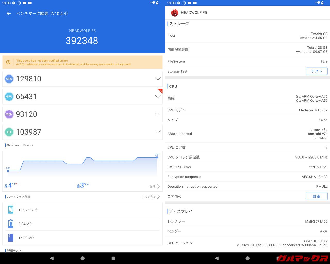 ▼Helio G99がどの程度動くSoCなのか以下の記事で解説してるのでどうぞ!HEADWOLF FPad 5も同じような動作です!↓