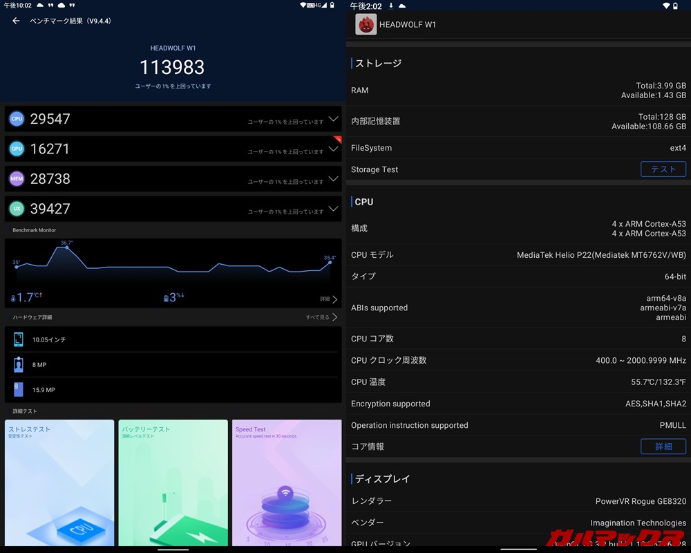 Helio P22、動作はやはりモッサリしていますが及第点です。まぁこれを常用するスマホとして使うぶんには厳しいんだけど、スマホほど使わないタブレットであればこのレベルでもOKかなって感じ!