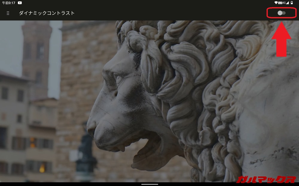 ▼またディスプレイ設定ではダイナミックコントラストがデフォルトで有効になっているのですが、動画によってはブロックノイズが出てきたりする場合もあったので切りました。あってもそれほど恩恵は感じないし、オフでも十分綺麗です。↓