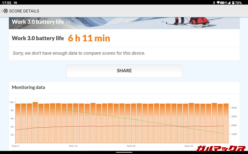 ▼PCMarkでテストしてみたら6時間11分と、(筆者基準ですが)平均の8時間よりも下でした。↓