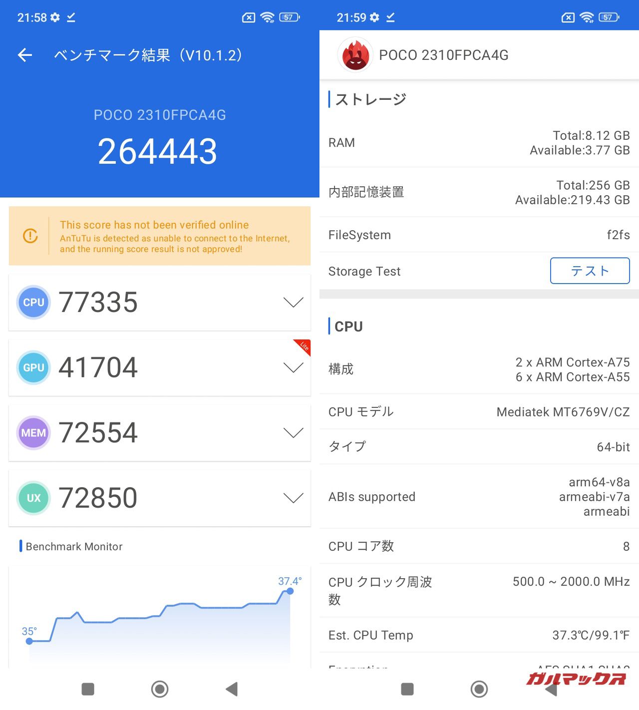 ▼端末の性能を数値化するAnTuTuのスコアを確認してみましょう。総合スコアは264,443点、GPUスコアは41,704点、UXは72,850点となっていました。↓