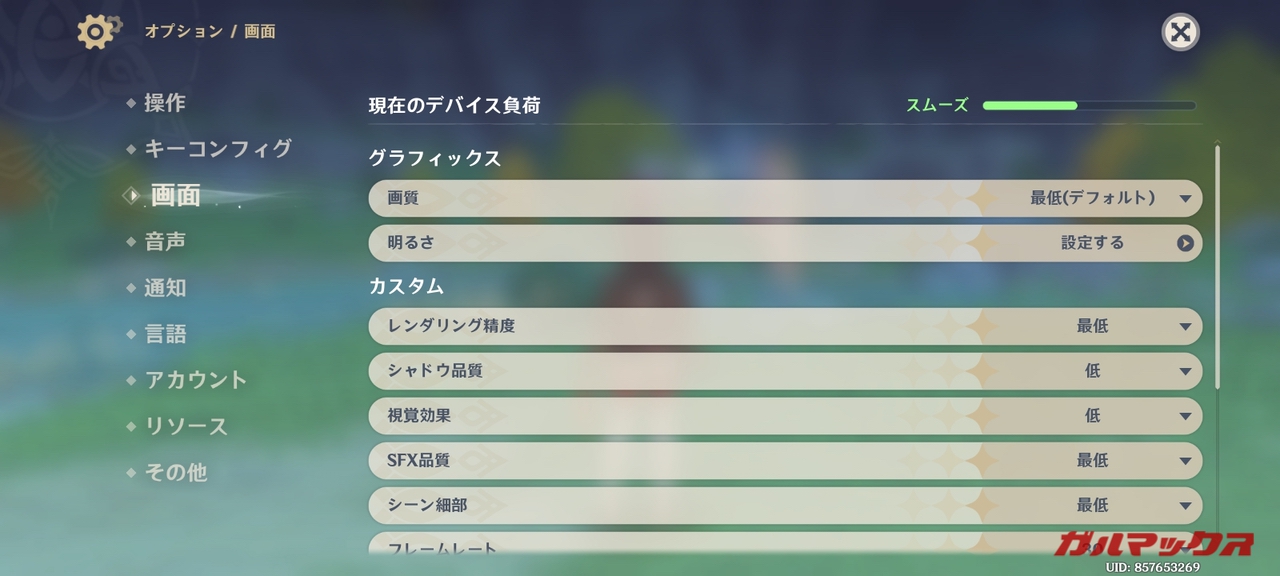 ▼まず重量級となる原神から。グラフィックのデフォルト設定は「最低」となっています。↓