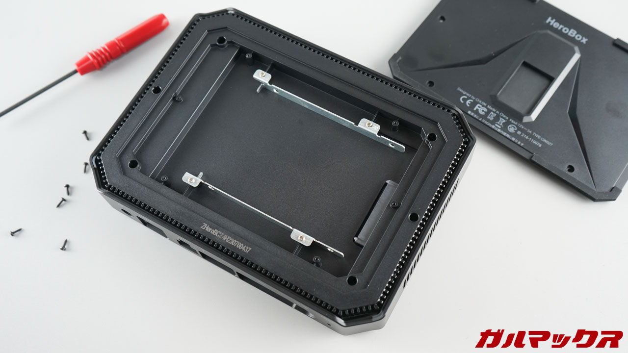 ▼本体裏のネジを外してSATA接続のストレージを挿すだけ。めちゃくちゃ簡単。↓
