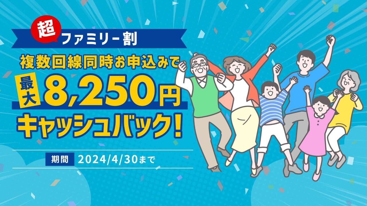 で、本題はここから。同時にキャッシュバックキャンペーンも開催していまして、それが結構注目度高い。今回発表された超ファミリー割の内容は以下の通りです。