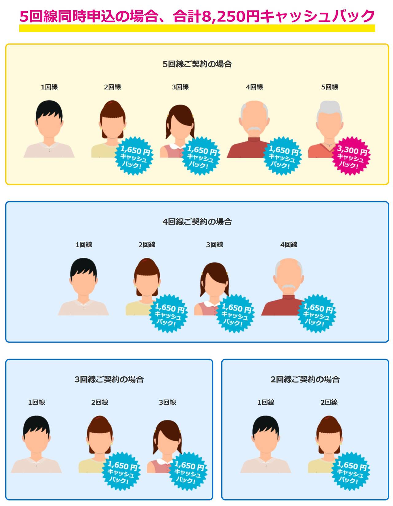 ▼キャッシュバックは1人につき1,650円。ただし5回線目のみ倍の3,300円キャッシュバックとなっています。累計8,250円!結構おトク。↓