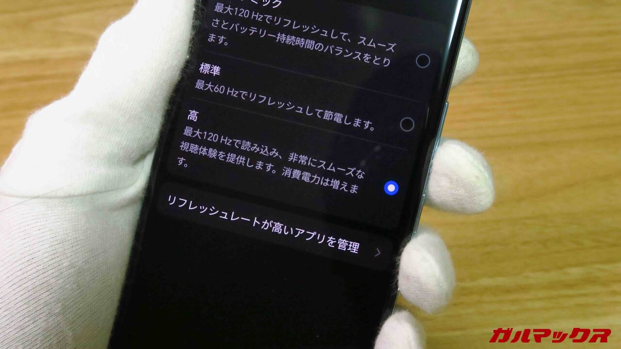 最大120Hzの高リフレッシュレートも対応ですが注意点があって、デフォルト設定「自動」だと公式・設定アプリでしか120Hz出ないらしく、TwitterとかLINEとかだと60Hzになっちゃいます。