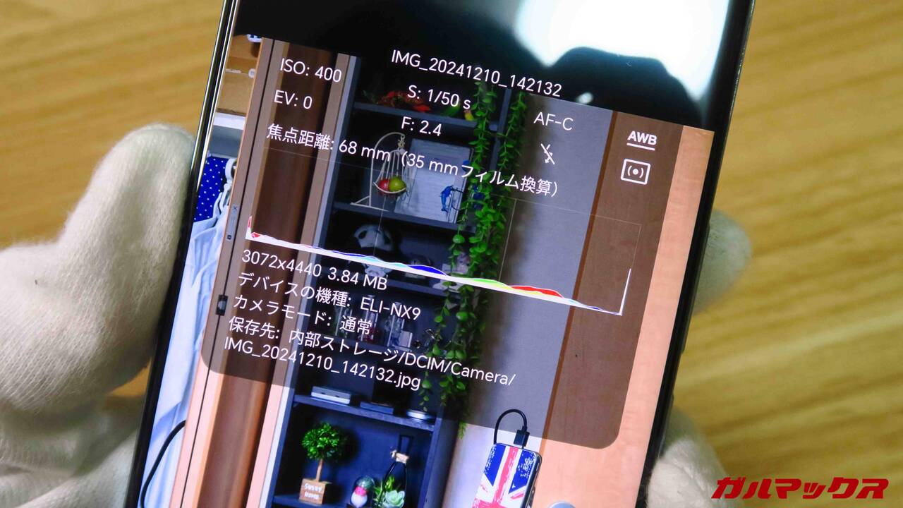 ▼あとギャラリーアプリも優秀。撮影した写真の情報もかなり細かく表示されます。ヒストグラムがあるのは初めて見た。↓