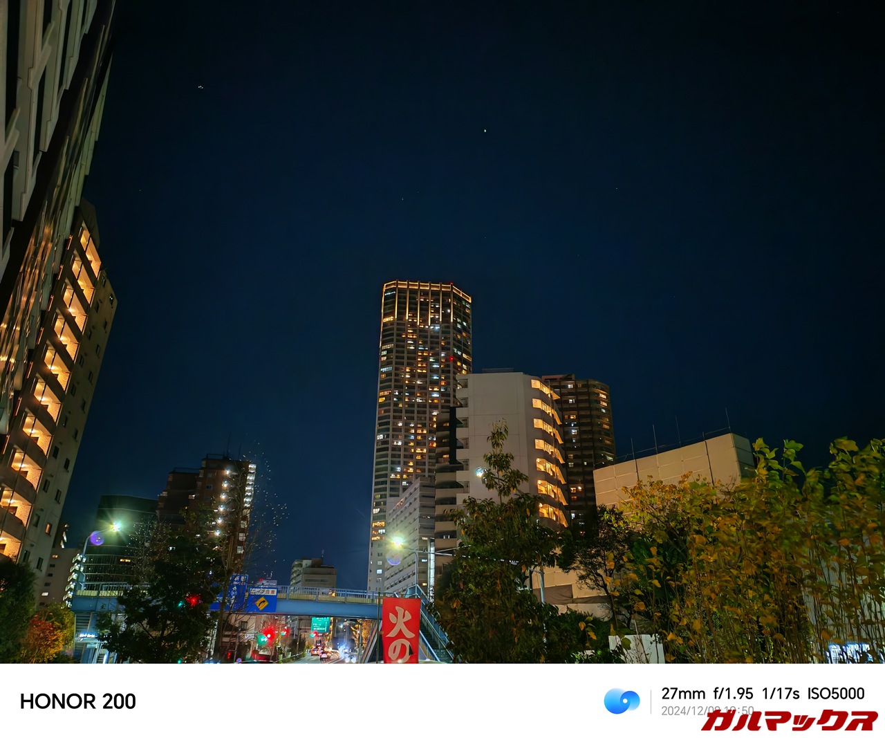 ▼こちらは夜景。撮影までの時間は2~3秒と結構かかりますが、クオリティはやはり素晴らしい。撮ってるだけで芸術的作品の出来上がり。木々のディテール、空の色、照明の白飛びの押さえも色表現もかなり好みです。↓