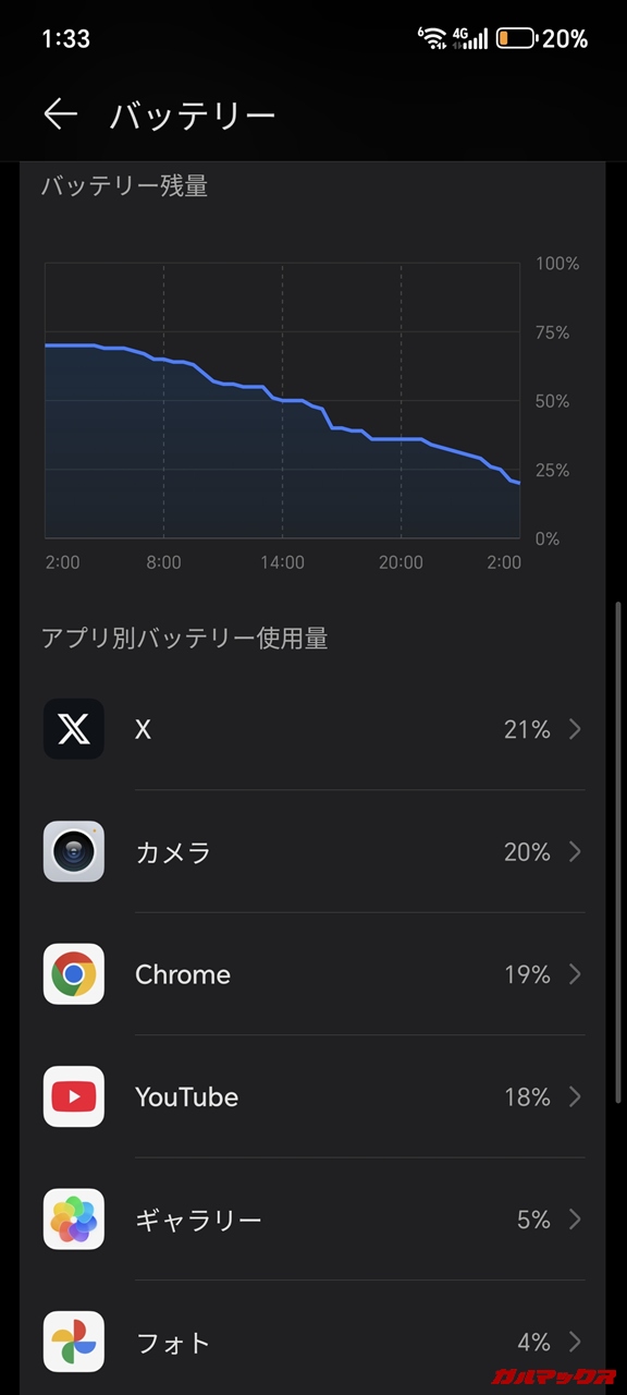 ▼電池持ちもバッチリで、ライトユースは勿論なんだけど動画視聴、撮影込みでの使い方でも1日は余裕でした。素晴らしい。今まで使ってたスマホの中でもトップレベルです(`・ω・´)。↓