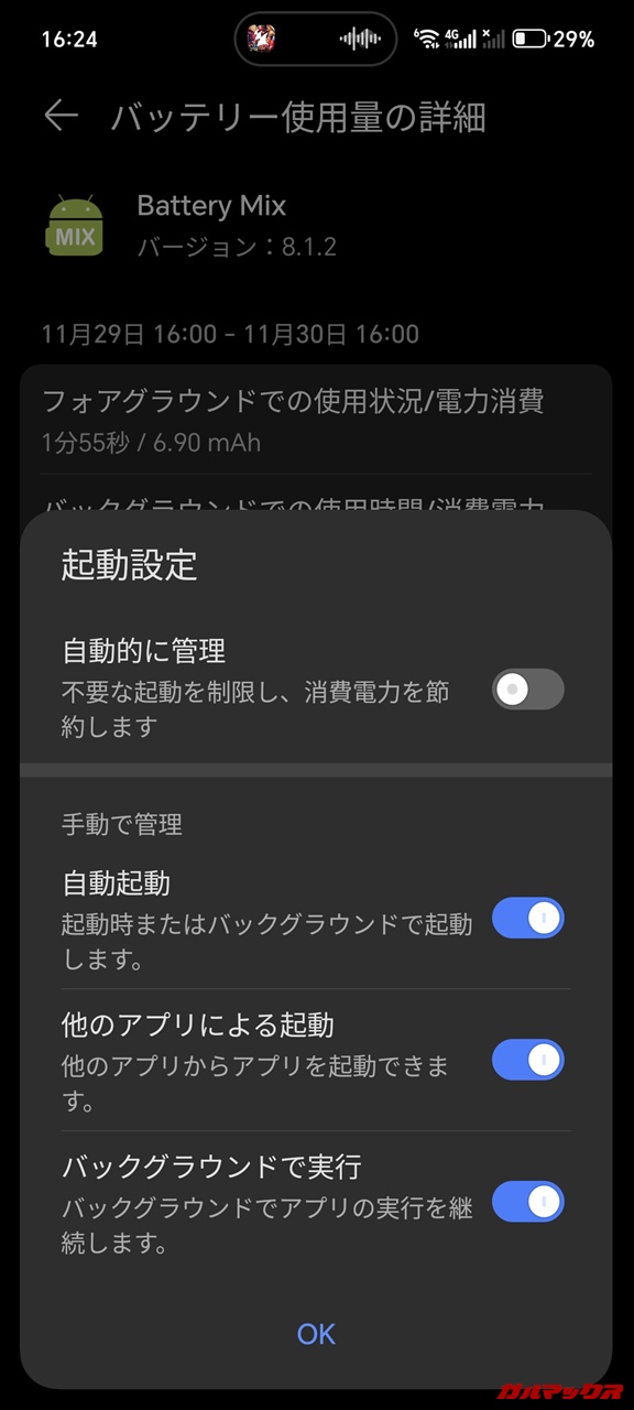 ▼ただし中華スマホの例に漏れず、アプリの制約が厳し目です。バックグラウンドアプリも勝手に閉じてしまう症例がちょくちょく起きて不便なんで、いちいちアプリの設定を変えてあげないといかんのは不便。だからこその電池持ちなんだろうけど‥↓