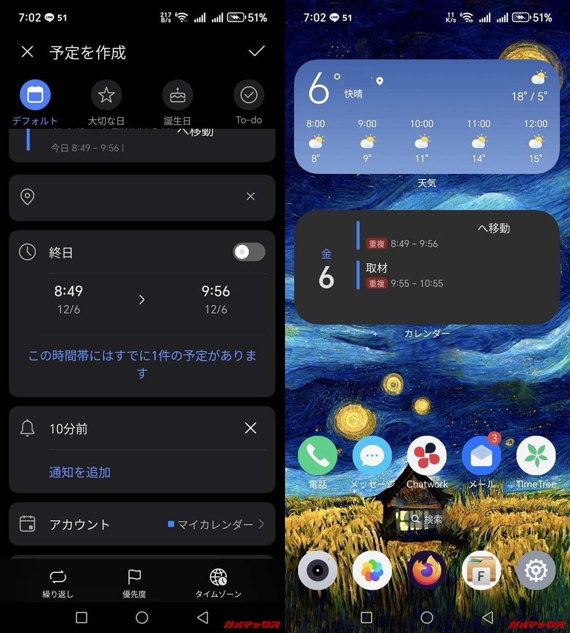 ▼プリインされているカレンダーアプリもGood。日時がダブってる他の予定があれば重複という表示も出てくるんで結構スケジューリングがやりやすかったです(`・ω・´)。↓