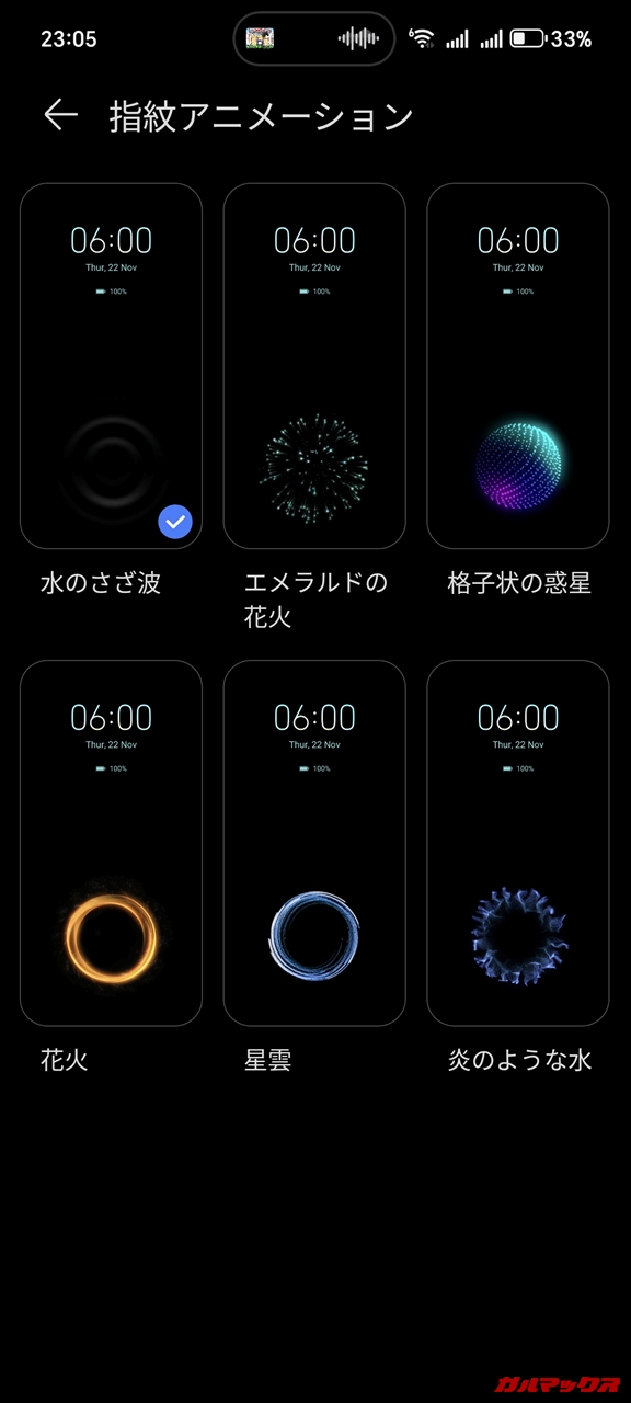 ▼あと指紋センサーに指を当てた際のアニメーションの設定も対応しており、計6種類から選べます。これ常用する機能なだけに、見てて楽しめる設定ができるのはやはり良いもんです(`・ω・´)。↓