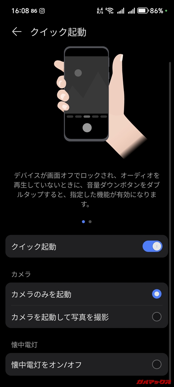 ▼クイック起動自体の設定はあり、カメラアプリの設定から組むことはできるんだけど、どういうわけか電源ではなく音量キー下の2回押しなんですよね。これ2019年あたりからあった謎仕様(Honor 10で確認)なんだけど、未だにこのままだったんだな‥↓