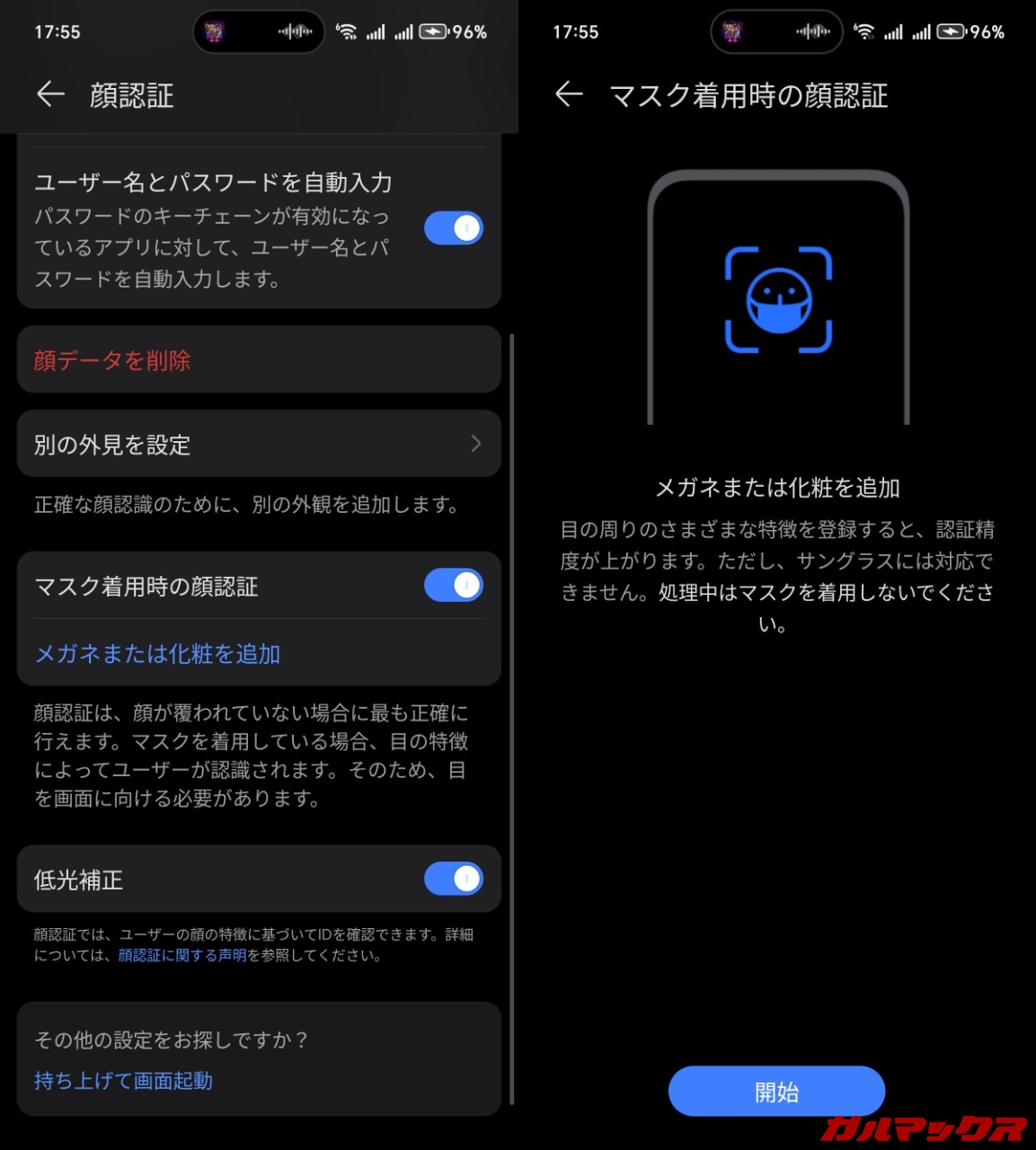 ▼顔認証は速度が非常に速かったです。速度は下がるものの暗所での認証も可能。またマスクやメガネ、化粧といったパターンの認識も行うことができます。↓
